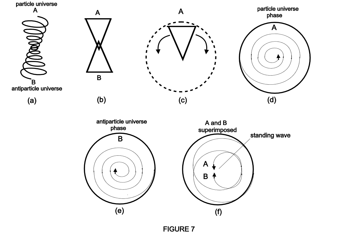 As an analogy the reader may wish to visualise a powerful whirlpool on the surface of a river. Let this surface be our 3D. This vortex, towards its centre, curves at right angles to the surface (representing 3D), that is, downwards below the surface (4D). Note that this corresponds to the geometry of a blackhole or wormhole. Now stop the vortex from going too deep into the water and imagine the mirror-image of the above-described whirlpool under the water flowing upwards. The two vortices flow in the same direction towards their own centres, which means when one and its mirror-image come together they are in opposition. They then create a ridge, pressure wave, or standing wave.