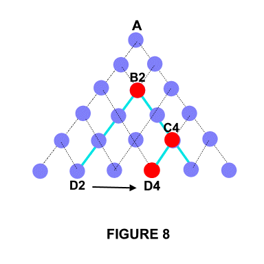 Let us repeat the schematic of Figure 4 (Part I) again in Figure 8. All the suggested pyramids (or triangles) are potential or existing vortices. There are four fractal levels in manifestation, A, B2, C4, D4 in this example. The blue dots represent the complete virtual-state Fractal Matrix. In terms of programmes, for a particle to go from D2 to D4, it must first address the vertex of a pyramid that encompasses both D2 and D4 as one whole quantum or fractal level. In Figure 8 this is a global control point B2 which has inherent within it position D4. Control would pass via global fractal B2, then sub-global fractal C4 to D4. This transit of the particle from D2 to D4 depends of course on the method of locomotion/propulsion (see Part IV). Object D2 might be pushed by means of a Newtonian force from D2 to D4 directly (in 3D).
