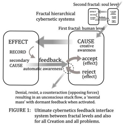 Note that the feedback mode communicates the activity of all imprints: memories, learning patterns, interface systems, all stored information, conscious or unconscious, including anything from conflict to trauma. The shock here is that science recognises only the feedback activity and not the CAUSE; strictly it then means there is no cybernetic loop---and no feedback. The reason is that science questions the meaning and existence of CAUSE. Where does it come from? What does it consist of? In metaphysics, New Age and religion, of course, this input CAUSE is regarded as the soul or from the soul. We shall show that there is no problem as to the soul's origin when we understand the application of the infinite fractal scale.[2] In the meantime the reader can regard CAUSE as a separate source in itself.