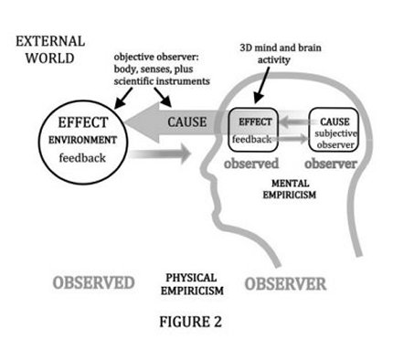 Thus, using Figure 1, the CAUSE (control and creation) in the above analogy is the human in the robot, the true observer. The EFFECT and the feedback is from the robot's programs and, with respect to CAUSE, this is what is observed, that is, the environment (whether physical or mental). Thus we have what we can call 'mental empiricism' (experiential scientific evaluations; that is, are based on experience, observations and measurement---not thought alone). This will be clarified shortly. Our population today does not know who or what the human is, nor does it know the purposes of being on this planet. Current mainstream knowledge teaches that CAUSE in Figure 1 is an illusion, or just a byproduct of the brain activity and feedback.