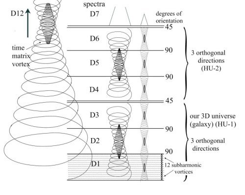 A TIME MATRIX of 12 dimensions of four harmonic universes (HU), consisting of three dimensions each: D1-3, D4-6, D7-9, D10-12.