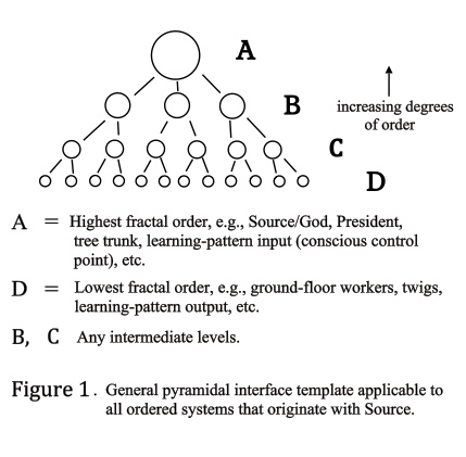 We shall see that this interconnectivity structure is also demonstrated by Figure 1. It not only manifests in the creative process, for example, the gradient between a single initial non-material Cause (from the Unmanifest) to a manifestation of material particle formats in the formation of structure, but in the dimensional layout of universes at fractal levels ordered from low (3D) to higher dimensionally. In fact, this could be termed a universal pyramidal interface system since it transforms one whole (compare president or God) into many parts (compare staff members). Note that even the Great Pyramid is included in this category---its special geometry acted as an interface device between the higher-order fifth-dimensional frequencies and 3D, the lower-order third-dimensional frequencies. [1]