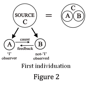 Firstly, at this basic level, we begin with the condition of no separation, no objectivity. Everything manifested must be inside the original Source---the latter must separate any thought projection from itself. We humans do this regularly when we resist, oppose, deny and experience undesirable effects, causing a standing-wave structure (two balanced opposing energy flows), which if repressed is stored away in the unconscious and can be reactivated and act separately against us. However, operating as the Source all this would be fully conscious; Figure 2. In the diagram, note that C can play the role of A in viewing B as separate, for example, an environment, and at the same time view A and B from C collectively. This is common amongst humans in good communication, without them being aware of it.