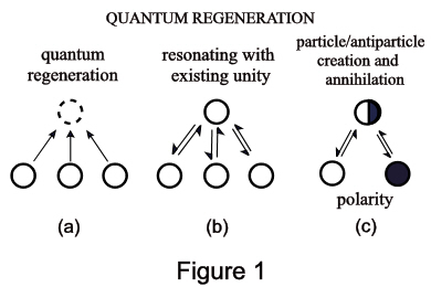 Now, naturally occurring entities already have the higher aspects present. Taking this into account, we can identify three features of quantum regeneration: 1) previously separate parts (any number) resonating to create (quantum-regenerate) a collective state that all the parts can now access instantly (Figure 1(a)); 2) to connect up to and resonate with an already existing single quantum state or unity (the fractal is manifest), such as all natural entities, cells, planets, star systems, galaxies (Figure 1(b)); and 3) two opposites, such as particle and antiparticle, apparently disappearing in a burst of energy, but in fact (and not recognised) quantum regenerating back to the state of unity in the next fractal spectrum (Figure 1(c)).