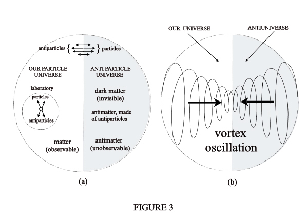 Note that when we add up all the matter and antimatter, it all cancels, as it should. Thus just as particles have antiparticles, so do universes have anti-universes but also other fractal levels. If for every particle there is an antiparticle then there must be anti-planets, anti-stars, anti-galaxies, etc. These are fractal levels and thus fractals have anti-fractals (for further confirmation see cosmic map article, also article on source of fractals). This is a huge 'shock' to science but current science is in its infancy. Unfortunately science hasn't even recognised that the vortex oscillation in Figure 3(b) is fundamental to all creation, whether in the small, such as particles or atoms, or in the large, such as galaxies or universes. (See article The Basic Energy Unit: The Vortex.)
