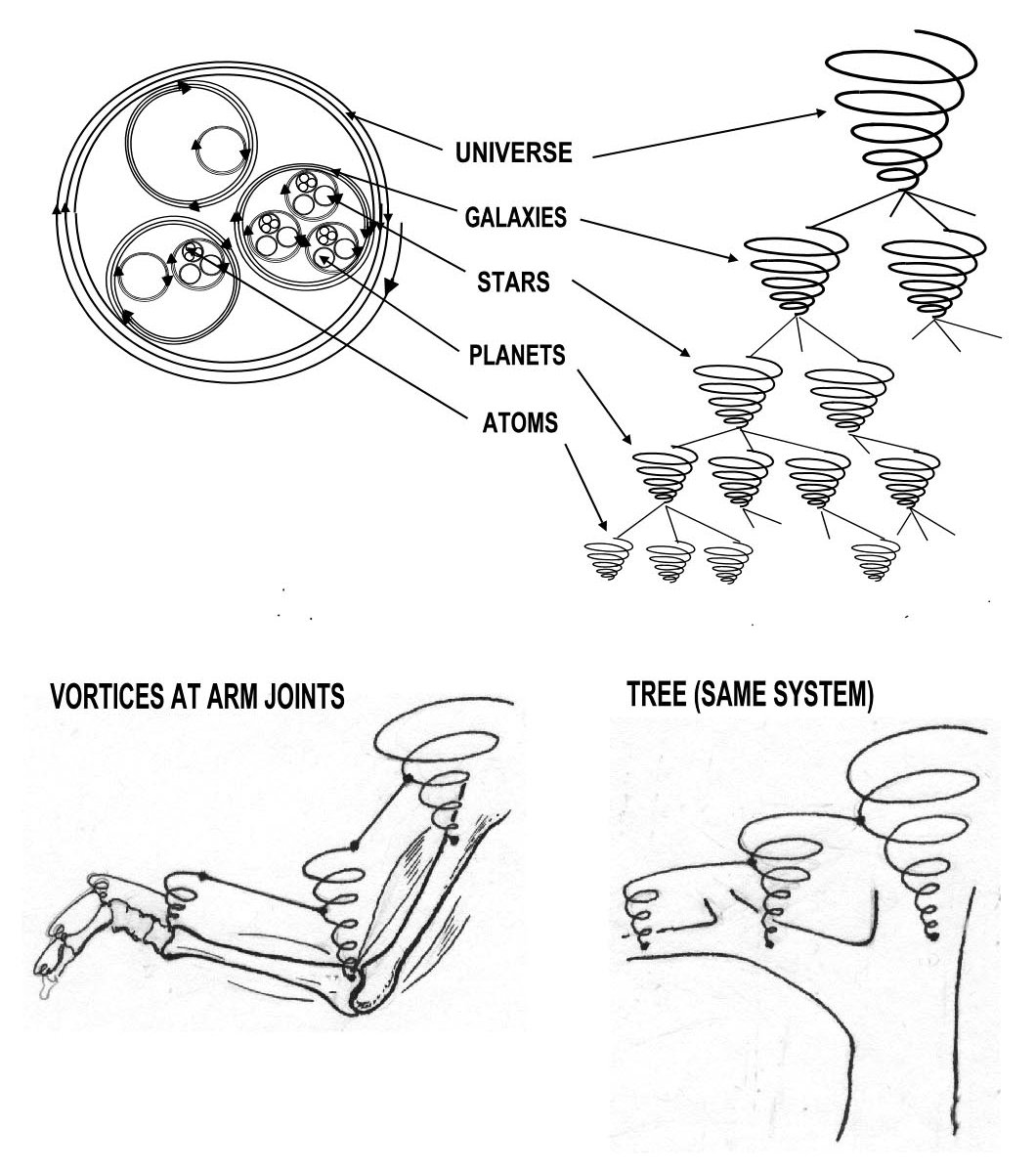The diagrams in the above figure are illustrating the same configuration as in the figures of Part II on physical mobility (opposite spirals not shown). The universe is basically like one big spiral with inner-fractal spirals. Remember, as we have stated previously, the spirals are necessary for energy to transduce from one dimensional level to another (and they always have an opposite spiral not shown).
