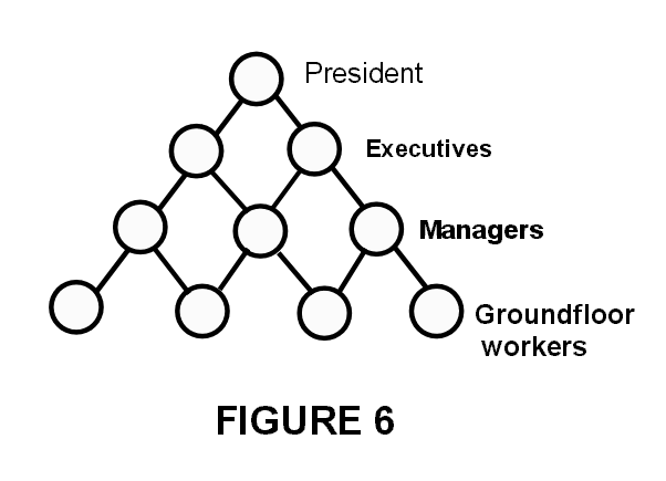 As we consider the block of typing sheets again in Part I, the quantum or wholeness levels go from one page to two pages (pages 1 and 2), to three pages thick (pages 1, 2, 3), etc., all the way to all the pages experienced as one whole; they can be considered as inherent and superimposed within the block. This is only like imagining in our general model of the pyramidal company organisation that the second level up, the managers (which constitutes information) are superimposed on the groundfloor workers nonlinearly. In fact with all levels the information of the managers, executives, president are inherent within the output produced by the groundfloor workers. This is modelling a hierarchy of fractal levels.